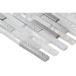 Made from a high quality white stone tile, this Ocean Crest Brick Glass Metal Stone Mosaic Tile is the perfect contemporary addition to your home décor. Each tile is easy to install since they are mounted on a 12 in. x 12 in. mesh mosaic. The mixed-sheen, mixed-finished tiles are versatile enough to be used outside. Perfect for kitchens, backsplashes, bathrooms, showers and accent walls.
